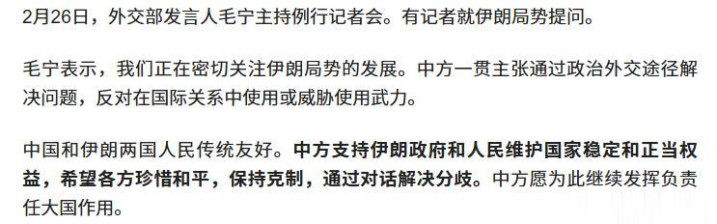 然后说中国和伊朗两国人民传统友好,中方支持伊朗政府和人民维护国家稳定和正当权益,这句话打破了美国逼中国选边的陷阱,中国的支持,不是军事介入,而是支持伊朗捍卫主权、反抗外部干涉。